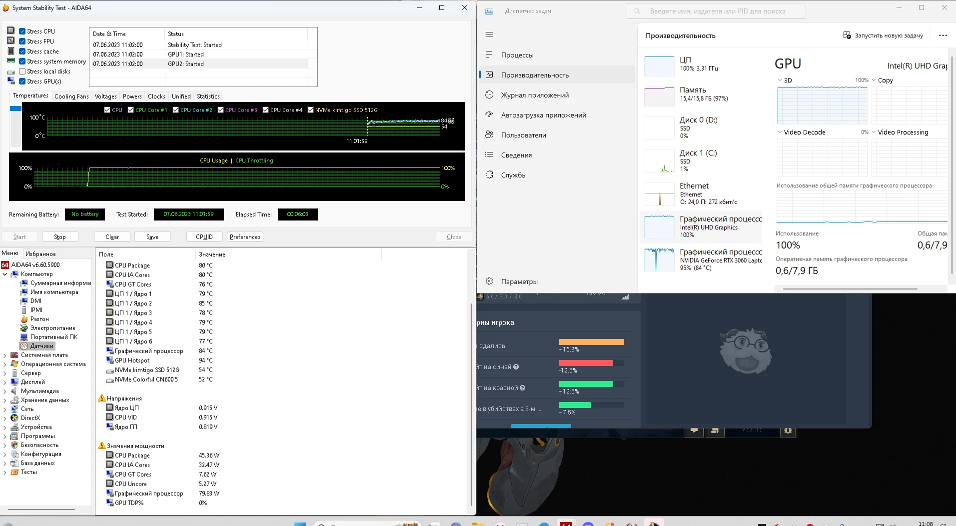 Всем привет! Нужна помощь с ноутбуком. Проблема возникает в игре League of Legends - падает количество кадров в секунду (fps), и на скриншоте видно, что видеокарта и процессор практически не загружены. Количество кадров в секунду скачет от 90 до 144, хотя ограничено настройками на 144 fps и вертикальной синхронизацией (выключена). В Apex Legends получаю около 90 fps (не знаю, нормально ли это для моего ноутбука), но и там иногда наблюдаются скачки. Я провел тесты в программе Aida64 и проверил с помощью Superposition Benchmark. Заметил странную вещь (по моему мнению) в тесте на разрешении 4K (40-48 fps), а на разрешении 1080p (30-38 fps). Раньше у меня была проблема с перегревом, но я ее исправил. Еще одна особенность заключается в том, что в League of Legends количество кадров в секунду одинаковое, независимо от того, на каких настройках игра запущена - низких или высоких. Я переустанавливал все драйвера и даже переустановил Windows