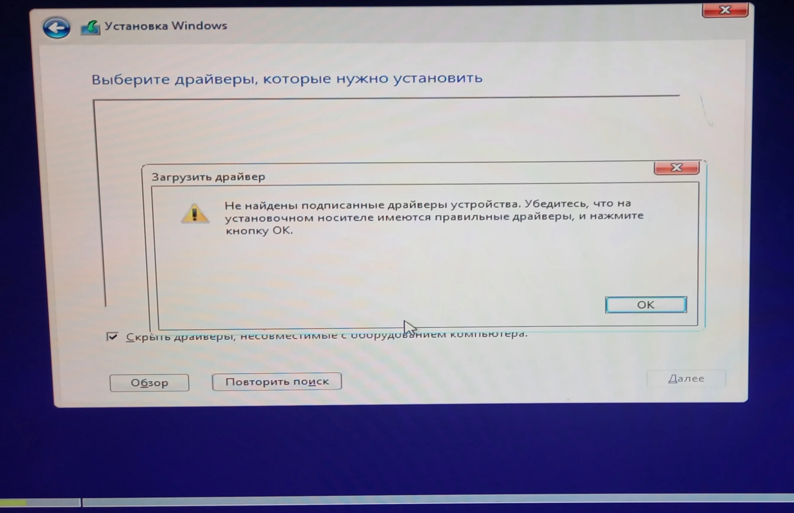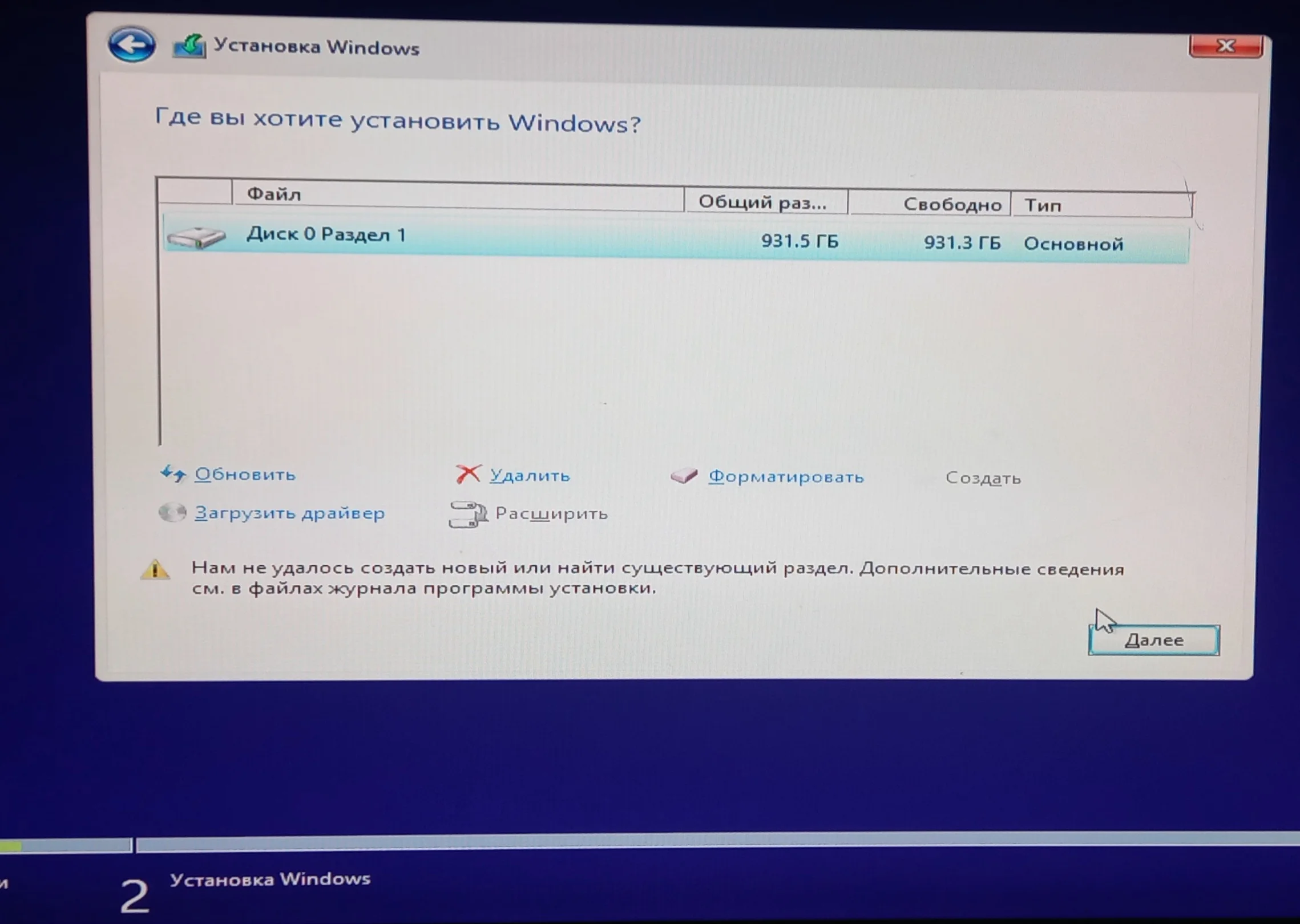 Было решено попробывать отформатировать жесткий диск и начать переустановку заново. Но после форматирования, при выборе Диска 0 Раздел 1, начал выдавать ошибку "Нам не удалось создать новый или найти существующий раздел. Дополнительные сведения см. в файлах журнала программы установки". Пробовал удалить диск и создать заново, при обновлении и загрузке драйверов, не находит драйвер установленный на флешку. Подскажите что делать? Как запустить ПК, второй день с ним борюсь