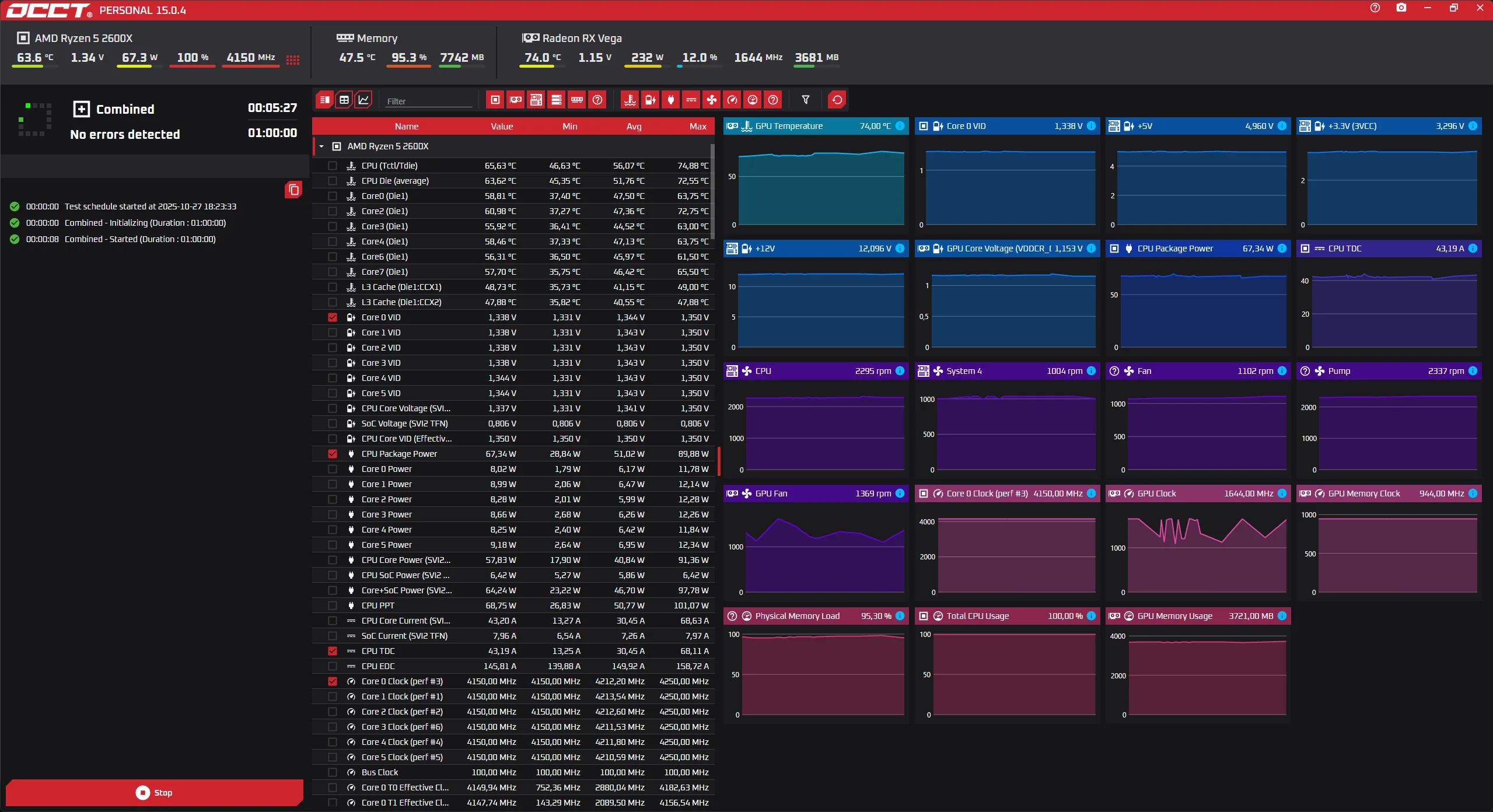 Вижу, что RX Vega 64 работает на 1644 МГц под нагрузкой - это хорошо. Температура 74 °C - норм. Power Consumption ~230 Вт - в пределах нормы для этой карты. В Adrenalin явно всё адекватно.